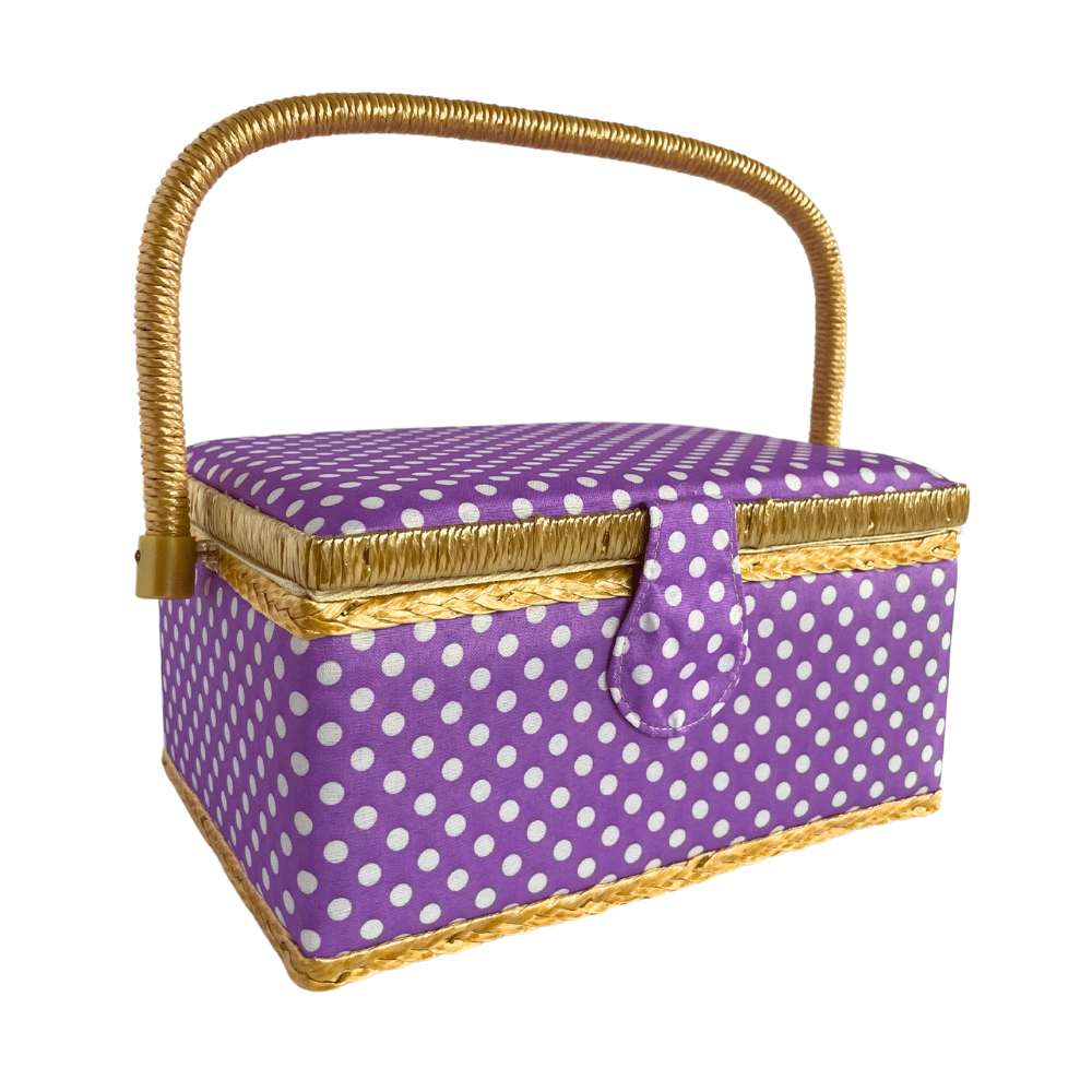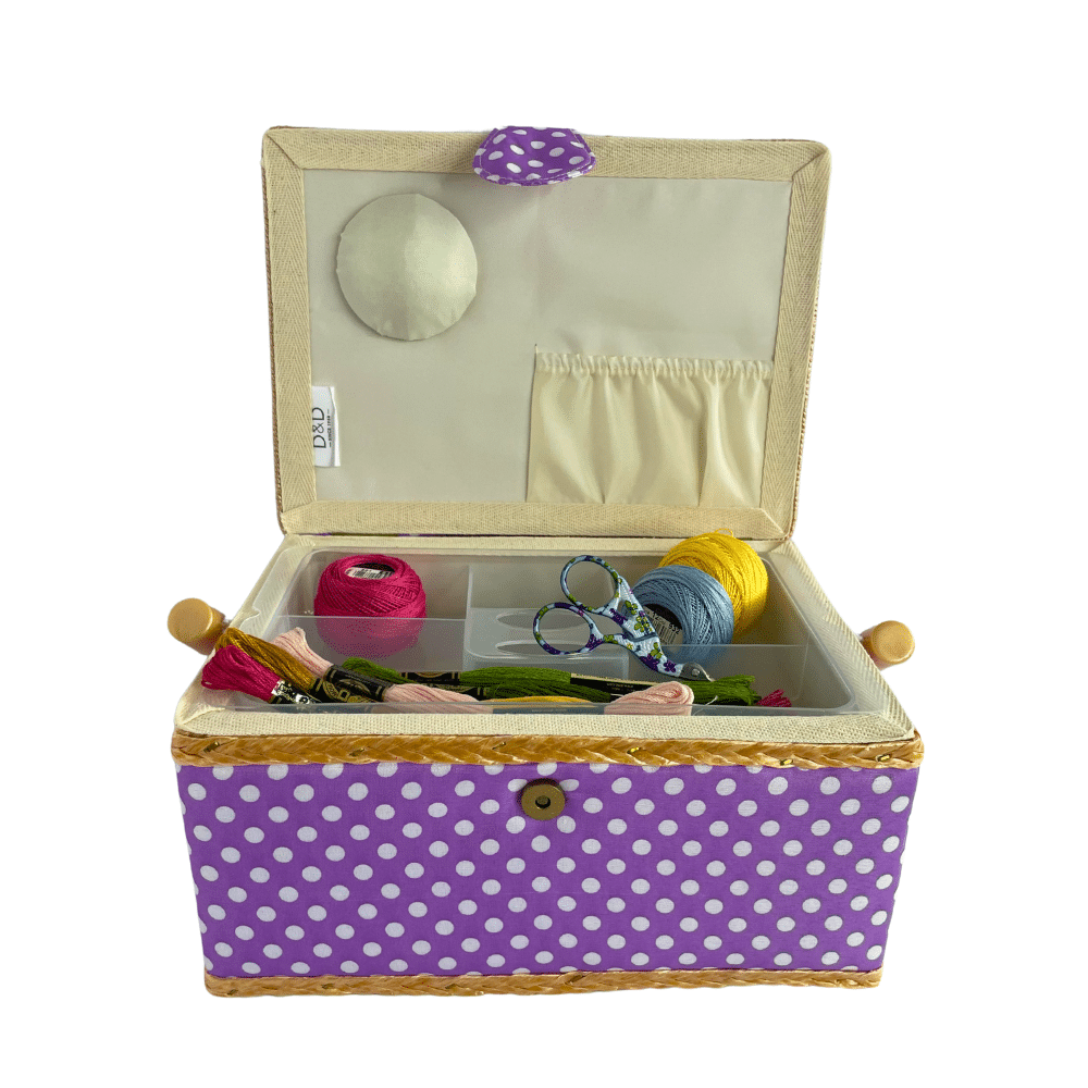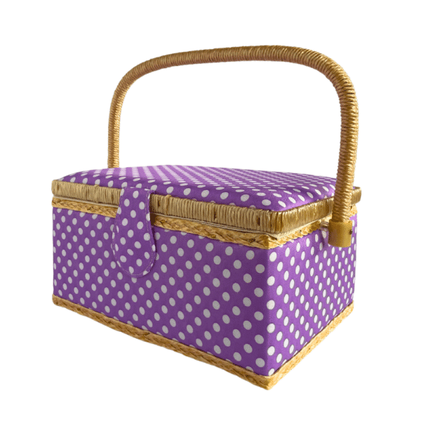 Este artículo de estructura de madera está forrado de tela acolchada con estampado morado con puntos blancos y decorado con un filo trenzado que asimila al mimbre. Cuenta con una charola extraíble de plástico donde podrás acomodar tus auxiliares más usados. En la parte interior de la tapa encontrarás una pequeña bolsa elástica y un alfiletero.