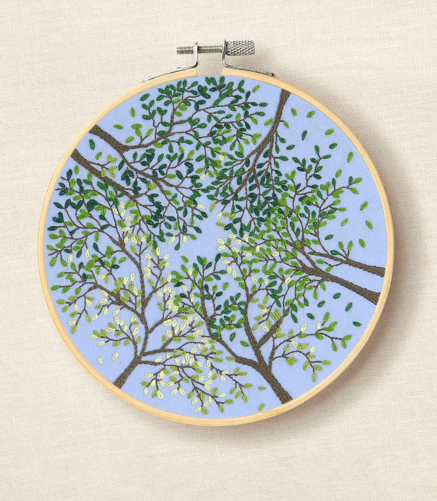 “Copas de árboles” es una creación de Nathalie Weinzaepflen que no sólo es fácil de elaborar sino que lo propone en un lienzo azul preimpreso que resalta los tonos verdes de las hojas para un acabado armonioso.