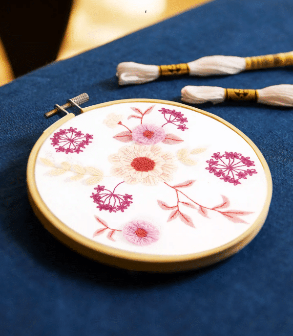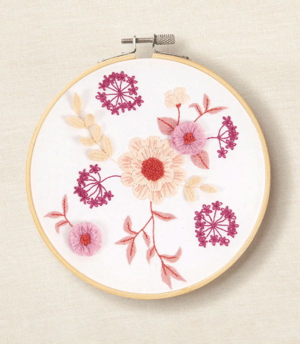 Diseñadores es una inspiración de Pascaline Latasse. Presenta delicadas margaritas y hojas en tonos rosas. Las puntadas picot y de pavo tejidas añaden un bonito efecto 3D. Es un proyecto ideal para bordadoras experimentadas y podrán apoyarse con los tutoriales que vienen en el QR de este producto.