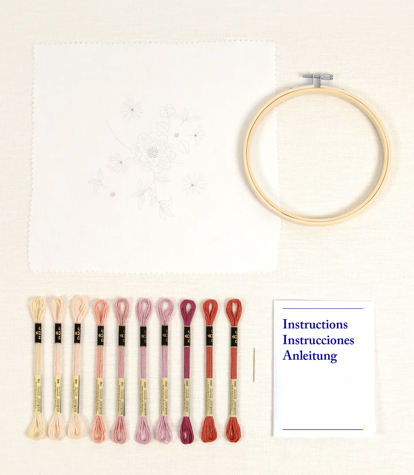 Contenido: 10 madejas de 2 m de Mouliné Spécial®; 1 tela estampada de algodón de 26 x 26 cm; 1 bastidor de 14,5 cm; 1 aguja; instrucciones y código QR con enlace a tutoriales en vídeo para punto de pavo y punto picot tejido.