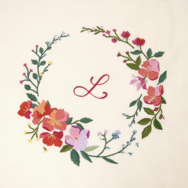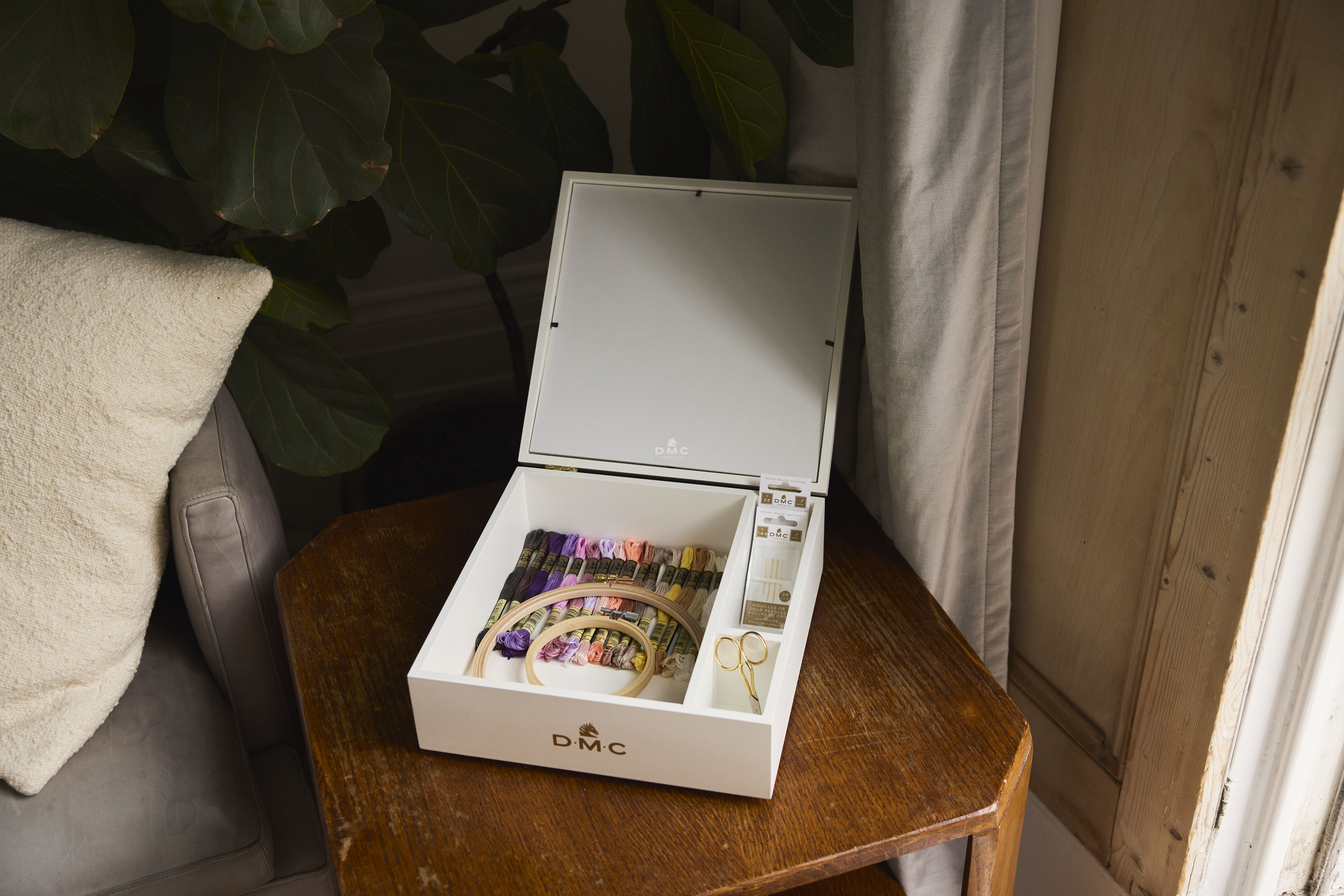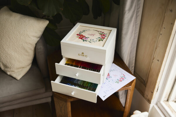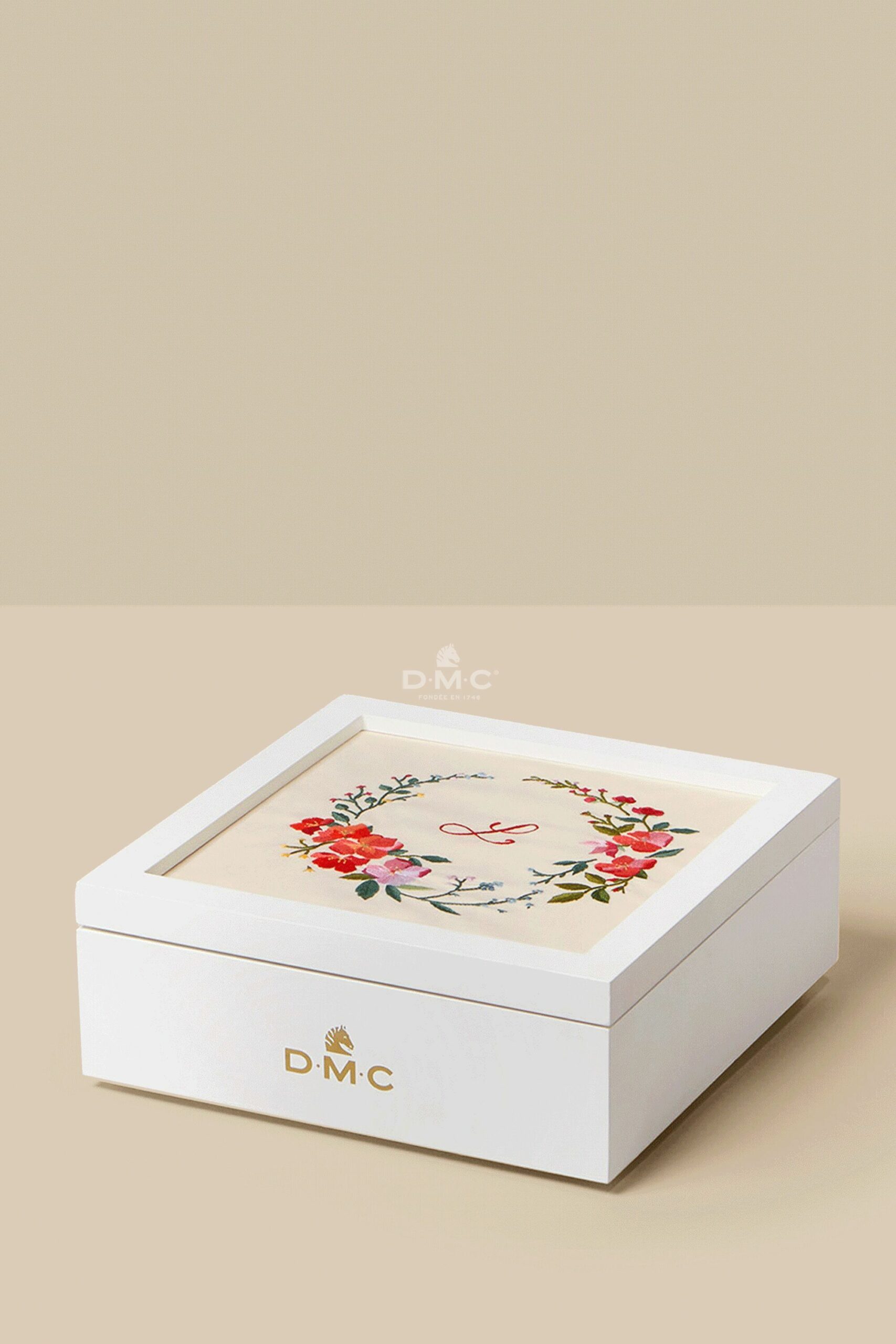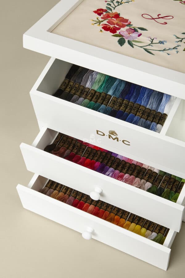 Contenido: Mueble de madera pintado en color blanco, tela de 100% algodón para bordarse, patrón con bordado tradicional y 70 madejas de hilo Mouliné Spécial.
