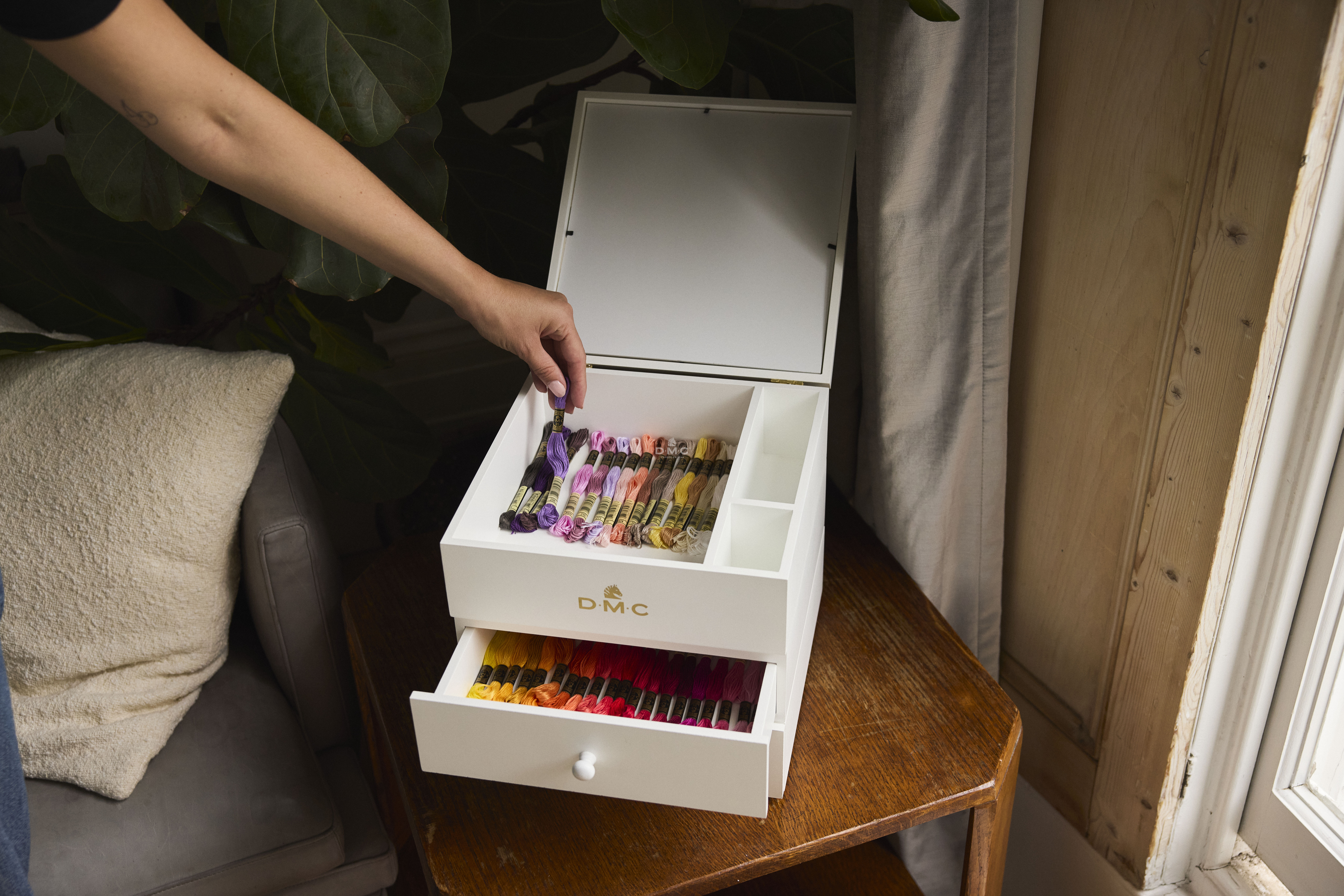 Está diseñado para su fácil traslado ya que está conformada por módulos separables y armables; puedes personalizarlo ya que en la parte superior cuenta con una ventana de acrílico para que le bordes el diseño de tu preferencia independientemente de que contiene ya un patrón. Este mismo cajón cuenta con compartimentos que te ayudarán a organizar mejor tus accesorios. El artículo trae como regalo 70 madejas de hilo Mouliné Special con una mezcla de tonos, claros, medios y oscuros.