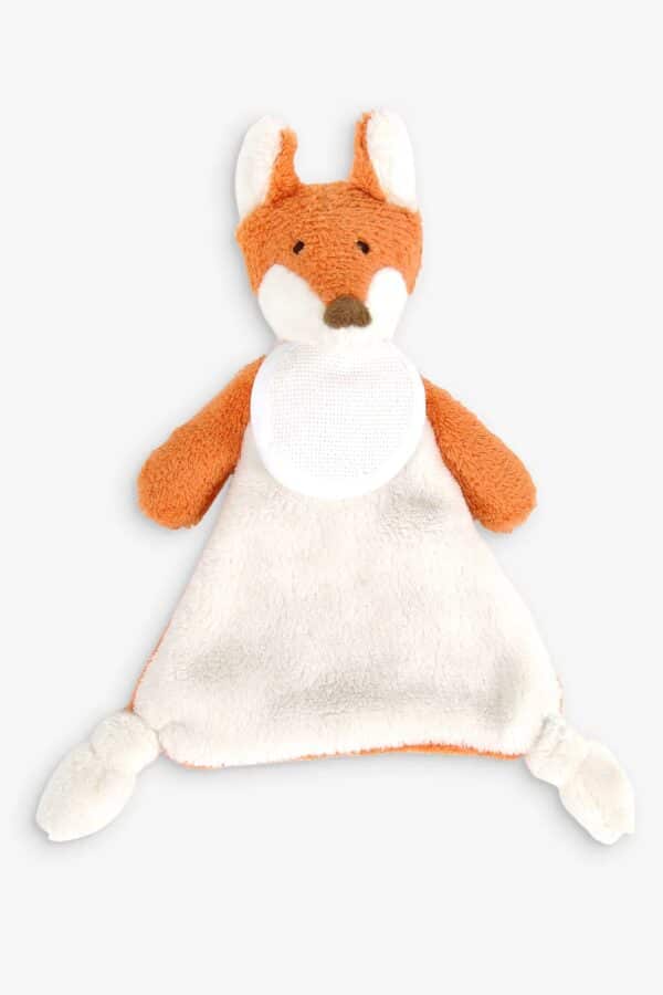 A los niños pequeños les encantará este suave peluche de zorro. Diseñado para calmar y relajar. Para darle un toque extra, utiliza el patrón incluido para personalizar la banda de tela Aïda 7 pts/cm de su babero con un pequeño diseño en punto de cruz, un nombre o una fecha especial.