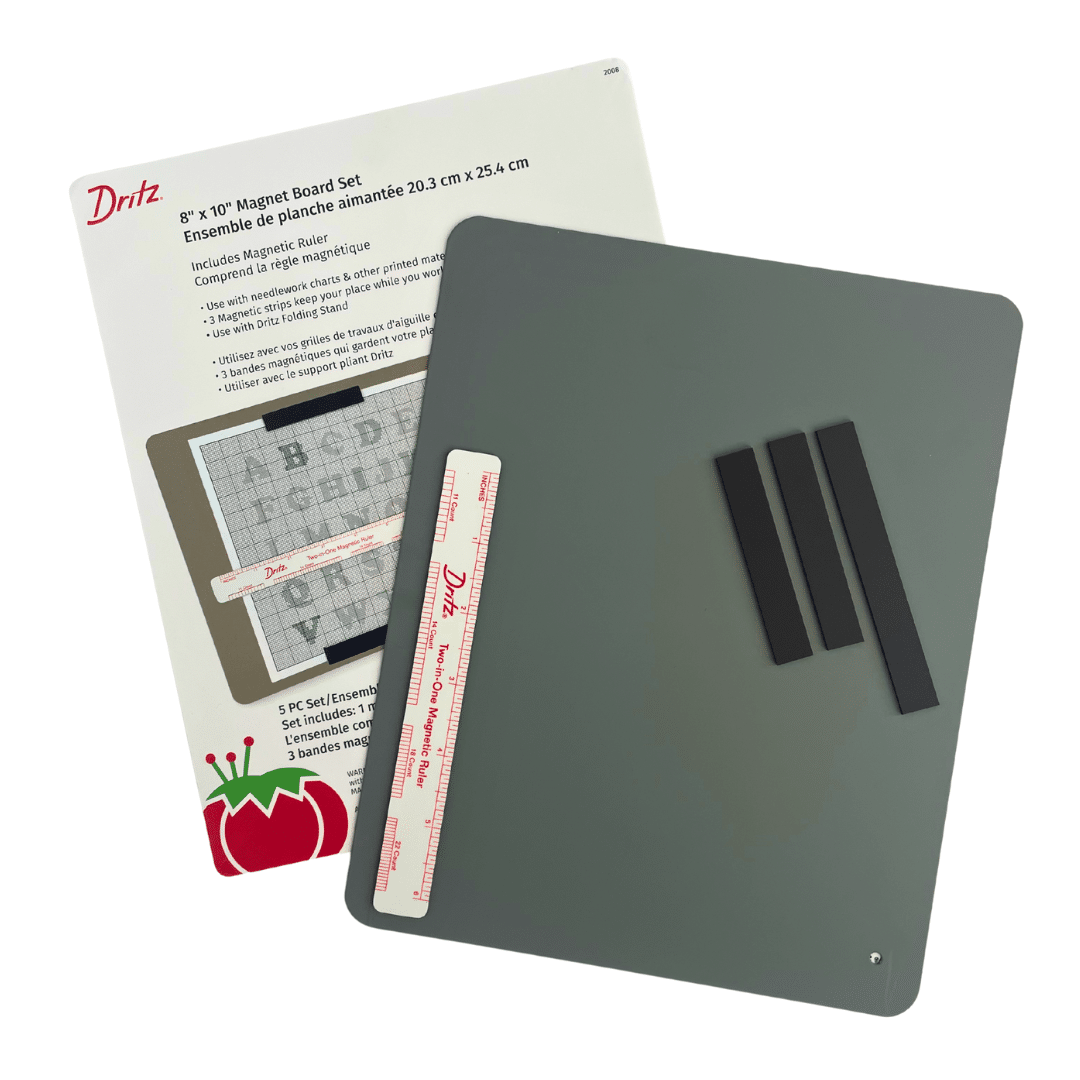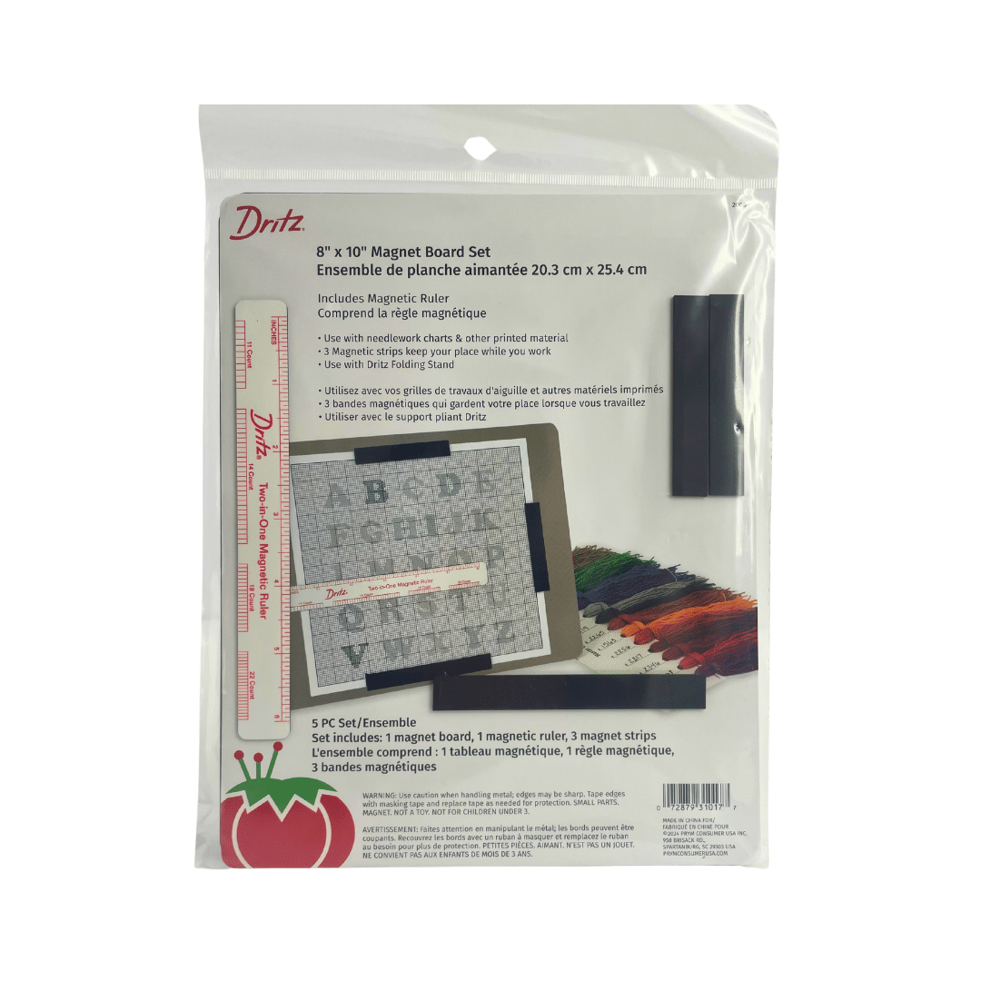 Este accesorio de la marca Dritz es ideal para aquellas personas que gustan del bordado ya que le permitirá colocar sus diseños y sostenerlos con los imanes. También cuanta con una regla magnética que le ayudará a tomar las medidas. Esta tabla magnética mide 20.3 x 25.4 cms