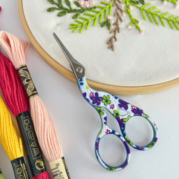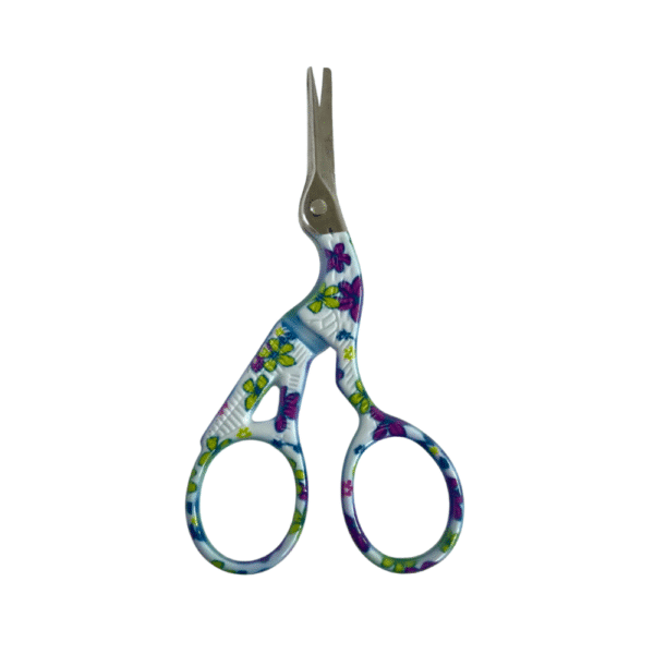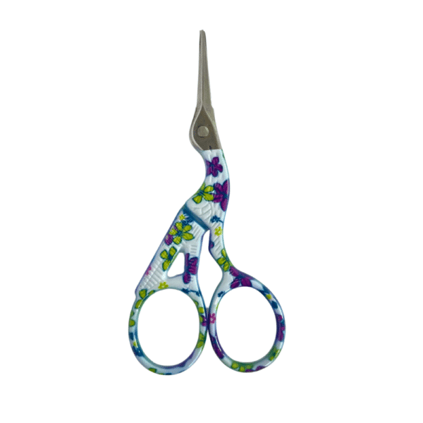 Tijeras de garza pequeña impresa con flores moradas con amarillo y fabricadas en acero inoxidable de alta calidad. Cuenta con una pequeña cuchilla por lo que se recomienda usar en labores más finas como bordado, costura, quiilting, tejido o actividades que impliquen hilos delgados.