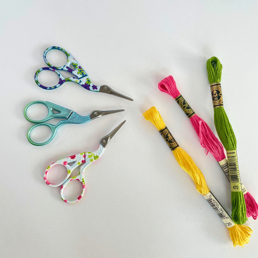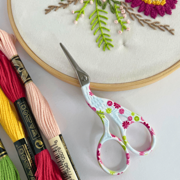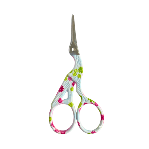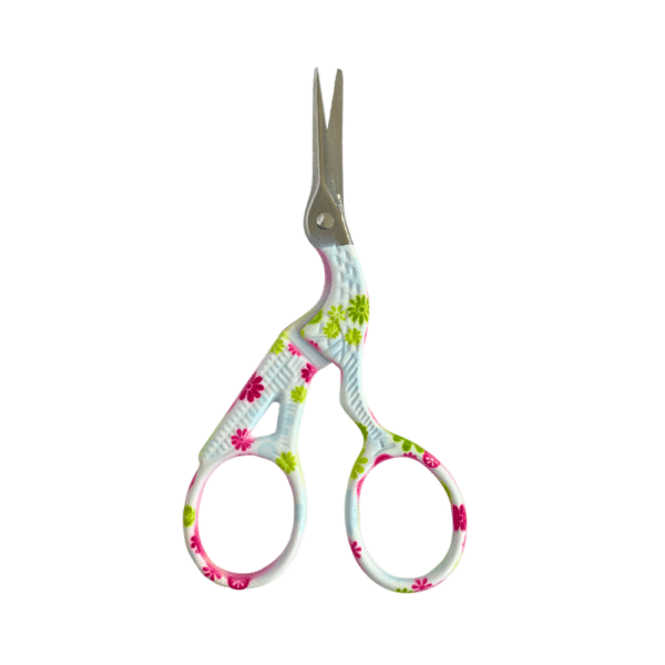 Tijeras de garza pequeña impresa con flores rosas y fabricadas en acero inoxidable de alta calidad. Cuenta con una pequeña cuchilla por lo que se recomienda usar en labores más finas como bordado, costura, quiilting, tejido o actividades que impliquen hilos delgados.