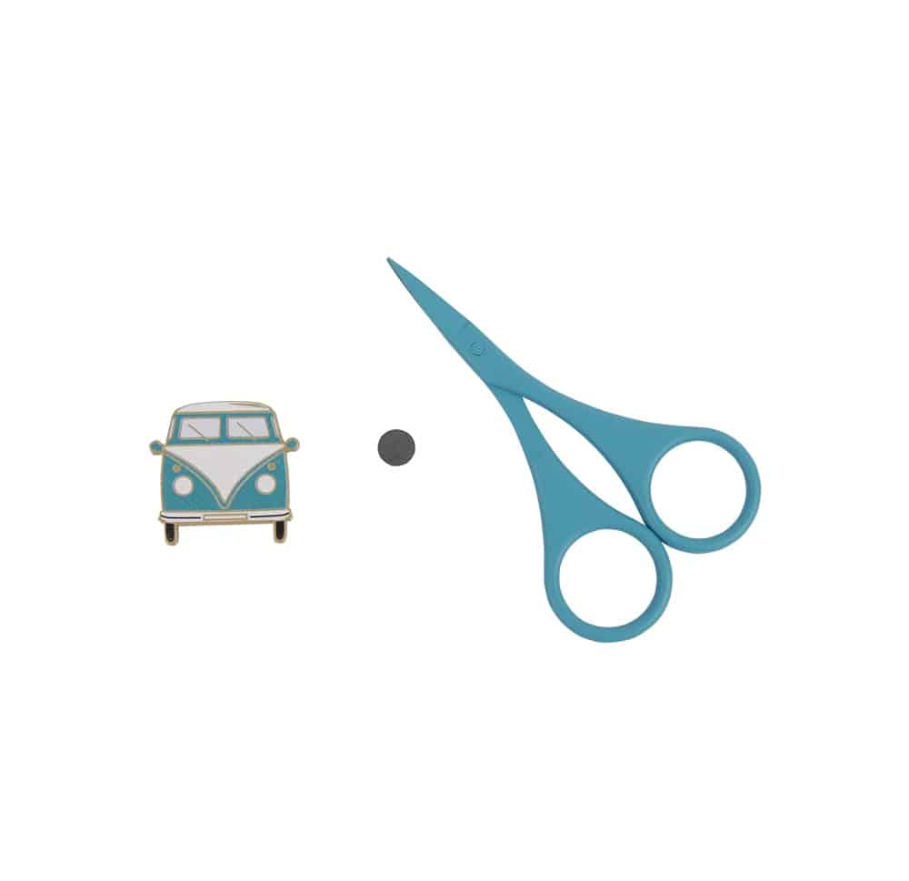Estas tijeras con diseño único en color verde vintage, vienen acompañadas de un imán que se coloca en la tela de trabajo para asegurar las agujas que estés ocupando en el momento por lo que te facilitará la labor de una forma segura.