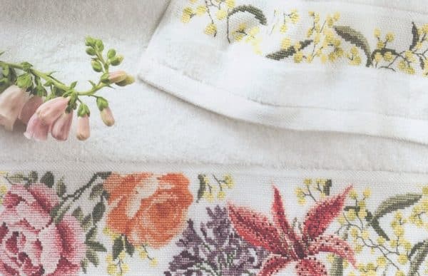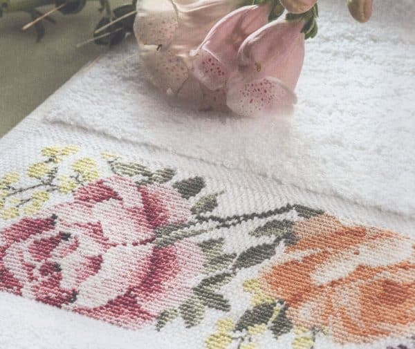 Toalla con capucha blanca para bebé. En la parte de gorro cuenta con una franja de cuadrillé para que la personalice en punto de cruz y tiene un acabado en bies azul.