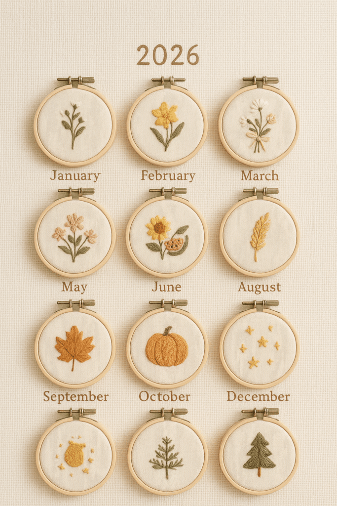 El calendario bordado funciona como un diario visual y bordarlo te permite hacer pausas mensuales para observarte, recordar y agradecer. Al final del año tendrás una obra que no solo es bella, sino profundamente significativa.