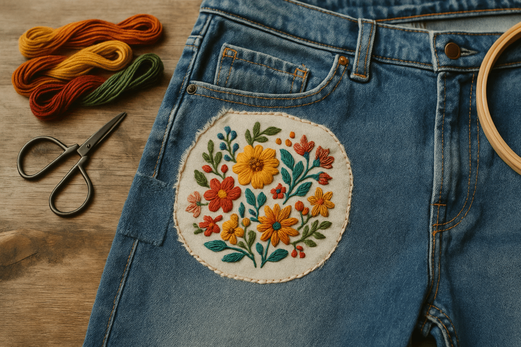 El bordado en prendas recicladas —mezclilla, camisas, chamarras, bolsos viejos— abre un universo de posibilidades. No se necesita perfección ni planificación: puedes cubrir parches desgastados, embellecer zonas simples o agregar color a piezas que ya no usas.